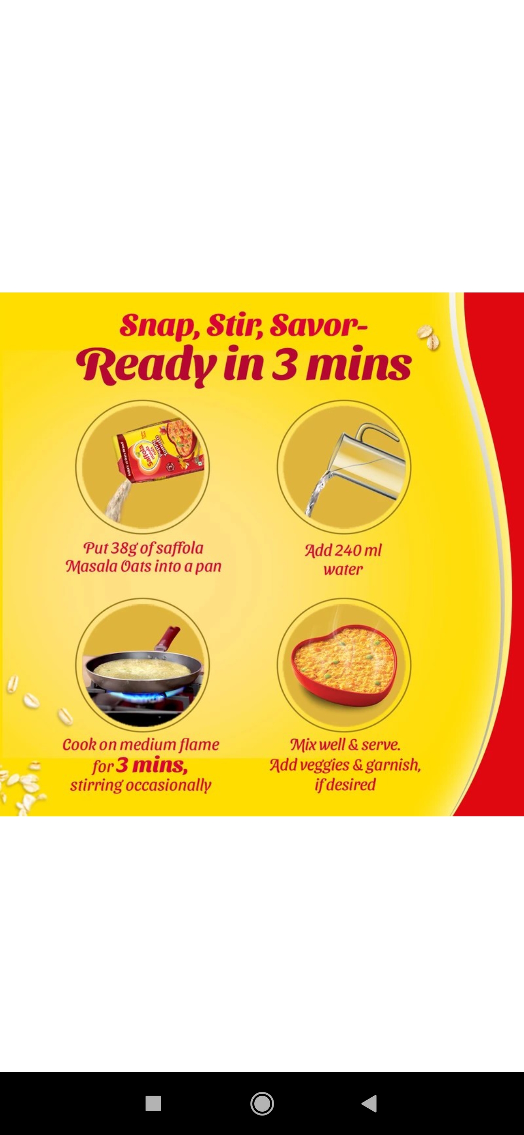 CONVENIENT TO MAKE:Ready in just 3 minutes, Saffola Masala Oats is super easy to make and super tasty to eat!